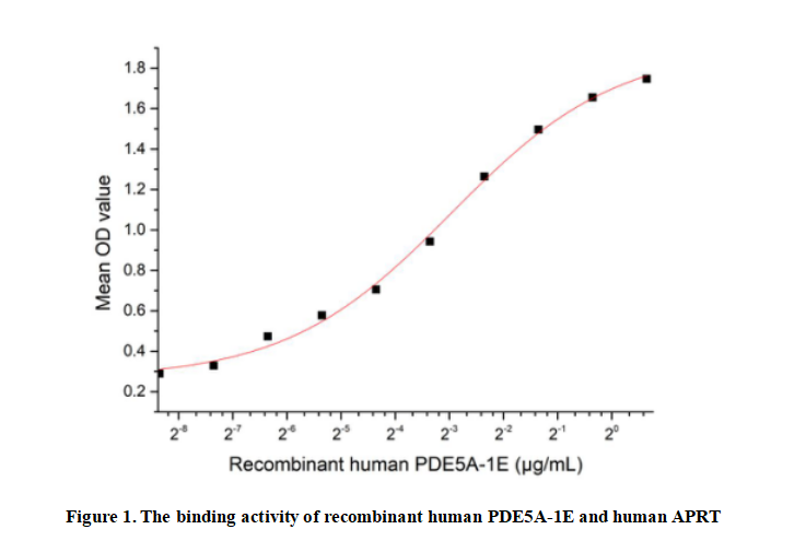 PDE5A-1E is a splice variant of phosphodiesterase 5A (PDE5A), a key member of the PDE superfamily that hydrolyzes cyclic guanosine monophosphate (cGMP), a critical second messenger regulating smooth muscle relaxation, vascular tone and cellular signaling. Expressed prominently in vascular smooth muscle, penile tissue and platelets, PDE5A-1E retains the core catalytic domain of wild-type PDE5A, enabling it to degrade cGMP and modulate downstream physiological processes like penile erection and blood pressure regulation. As a unique isoform, it has distinct tissue expression patterns and functional characteristics compared to other PDE5A variants, making it a vital therapeutic target for erectile dysfunction and pulmonary arterial hypertension. Additionally, PDE5A-1E physically interacts with APRT, forming a protein complex with unclear functional implications.Thus a functional ELISA assay was conducted to detect the interaction of recombinant human PDE5A-1E and recombinant human APRT. Briefly, PDE5A-1E was diluted serially in PBS with 0.01% BSA (pH 7.4). Duplicate samples of 100 μl were then transferred to APRT-coated microtiter wells and incubated for 1h at 37℃. Wells were washed with PBST and incubated for 1h with anti-PDE5A-1E pAb, then aspirated and washed 3 times. After incubas. With the addition of substrate solution, wells were incubated 15-25 minutes at 37℃. Finally, add 50 µL stop solution to the wells and read at 450/630nm immediately. The binding activity of recombinant human PDE5A-1E and recombinant human APRT was shown in Figure 1, the EC50 for this effect is 0.128µg/mL.