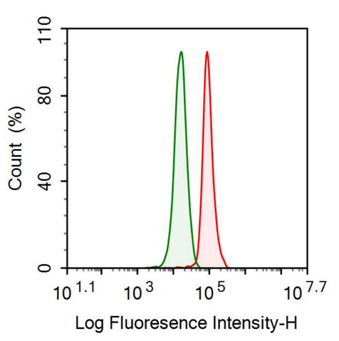 • 抗α1-B-糖蛋白(a1BG)单克隆抗体Human HepG2 cell line was fixed with 2% paraformaldehyde (10 min) , permeabilised with 0.1% BSA-Triton X-100,then stained with 10µg/ml mouse Anti-human a1BG Monoclonal Antibody (Catalog FAE570Hu00, red histogram) or Isotype control antibody (Catalog IS067-Mu01, green histogram), followed by 1µg/ml FITC-conjugated Anti-mouse IgG Secondary Antibody (Catalog SAA544Mu18).