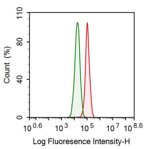 • 抗抑制素α(INHa)单克隆抗体Human MCF7 cell line was fixed with 2% paraformaldehyde (10 min) , permeabilised with 0.1% BSA-Triton X-100,then stained with 10µg/ml mouse Anti-human INHA Monoclonal Antibody (Catalog FAA395Hu08, red histogram) or Isotype control antibody (Catalog IS067-Mu02, green histogram), followed by 1µg/ml FITC-conjugated Anti-mouse IgG Secondary Antibody (Catalog SAA544Mu18).