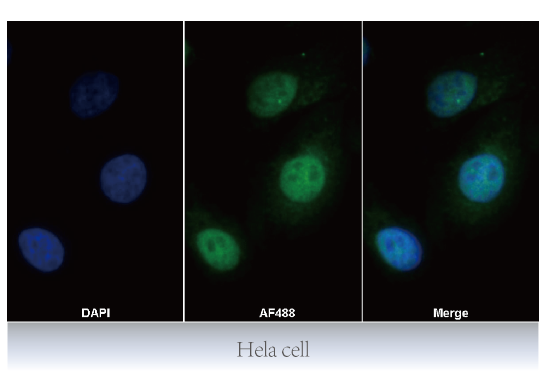 图2. 使用OTUB1 WB+IHC+IF应用优势产品(绿色)对细胞进行IF分析