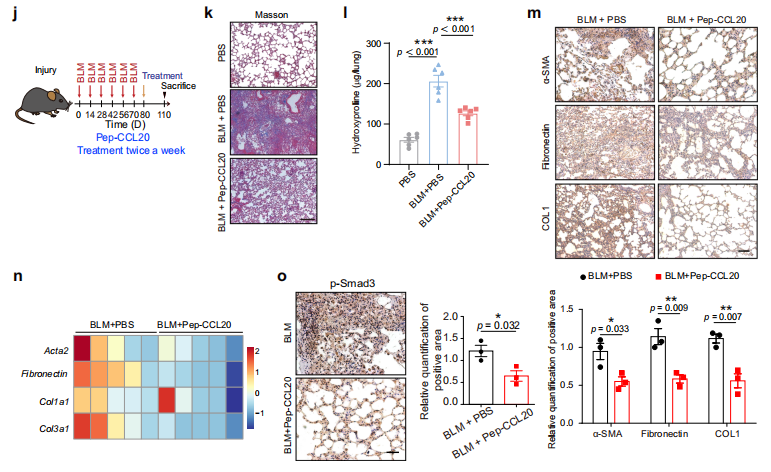 CoIP分析确定Pep-CCL20是否会干扰CCL20与整合素α5β1的相互作用,发现Pep-CCL20减少了CCL20与整合素α5的相互作用,但不影响CCL20与整合素β1的相互作用。Pep-CCL20降低了MRC-5细胞中活性TGF-β的丰度,并抑制了CCL20诱导的原代肺成纤维细胞活化,表现为α-SMA和COL1表达降低以及迁移能力下降。BLM暴露后第10天用Pep-CCL20处理小鼠,40天后处死。给予Pep-CCL20显著减轻了BLM诱导的肺损伤和纤维化,表现为胶原蛋白沉积减少和羟脯氨酸水平降低,小鼠肺中α-SMA、纤连蛋白、COL1、Col3a1和 p-Smad3的表达显著降低(图6)。
