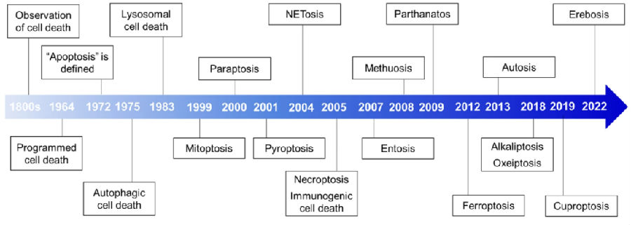 查看详情细胞死亡是所有细胞最终的宿命,细胞死亡的方式是生物医学领域的重大研究热点,涉及多种复杂的生物学机制。细胞死亡的主要功能是通过去除无功能、受损和有害的细胞来维持组织稳态。2005年第一届细胞死亡学术命名委员会对细胞死亡做出了较为清晰的定义,将细胞死亡定义为不同于濒死细胞的可逆细胞状态,死亡细胞是指细胞到达生命终点,处于不可逆转的状态。图1. 细胞死亡发现的时间点一、细胞死亡的分类细胞死亡主要有两种方式:坏死和程序性细胞死亡(PCD)。坏死是一种非程序性的细胞死亡形式,通常由创伤性损伤引起;PCD是一种受......