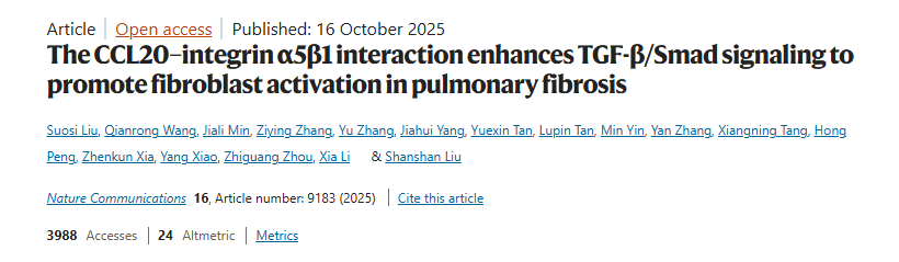 查看详情肺纤维化(PF)是多数弥漫性肺间质疾病的终末阶段,以肺泡壁损伤、细胞外基质(ECM)过度沉积、最终呼吸衰竭为特征,包括特发性肺纤维化(IPF)及其他诱因明确的纤维增殖性肺病。现有治疗药物(尼达尼布、吡非尼酮)疗效有限且存在明显毒性,治疗效果仍未能满足临床需求。因此,探索PF潜在的细胞和分子机制并发现新的治疗靶点迫在眉睫。2025年10月,《Nature》杂志上发表了一篇题为“The CCL20–integrin α5β1 interaction enhances TGF-β/Smad signaling to promote fibroblast activation in pulmonary fibrosis”的文章,在这项研究......