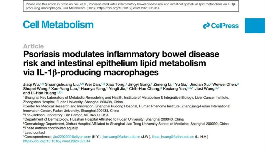 查看详情2026 年 3 月 18 日,复旦大学黄立豪、王嘉希教授团队以及复旦大学附属华山医院颜克香教授作为共同通讯作者在《Cell Metabolism》在线发表标题为 “Psoriasis modulates inflammatory bowel disease risk and intestinal epithelium lipid metabolism via IL-1β-producing macrophages” 的研究。该研究揭示了银屑病与炎症性肠病共病的新机制。研究发现,银屑病严重程度与人体餐后载脂蛋白APOB48水平呈负相关,银屑病会促使肠道产生IL-1β的巨噬细胞扩增。这些巨噬细胞会加速APOB降解,损害乳糜微粒分泌,导致肠上皮脂质堆积,加剧黏膜......